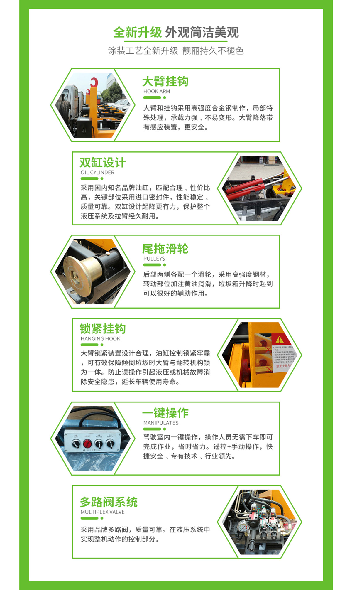 底盤配置:柳機113馬力,1650單排駕駛室,5檔變速箱,175R14真空輪胎【后雙輪】,前后橋1.5/2.5。標配動力轉向,前盤制動,中控門鎖,電動門窗,定速巡航,藍牙電話,LED日間行車燈,空調,預留取力器窗口。 上裝配置:勾臂垃圾車標配:由液壓系統、操作系統、拉臂,組成。舉升油制缸為國內知名液壓件廠家生產的雙作用油缸,多路閥液壓控制,操作員手動控制垃圾廂吊上放下,帶自卸功能,上下一次工作循環(huán)時間≤40秒。垃圾箱冷板壓制垃圾箱,帶后門密封圈,帶金屬滾動輪。 |