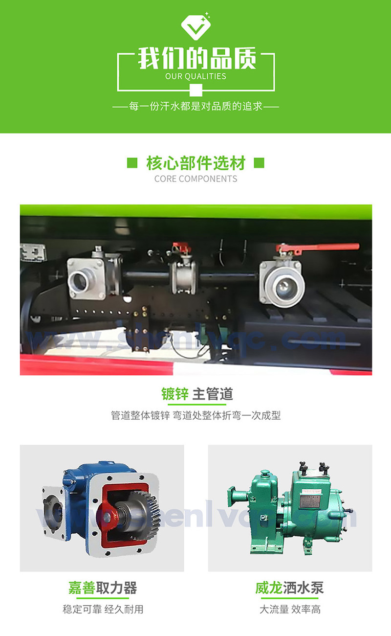 前沖、后灑、側(cè)噴、后平臺(tái)高炮、自流閥、消防接頭、濾網(wǎng)、噴頭、帶自吸自排。